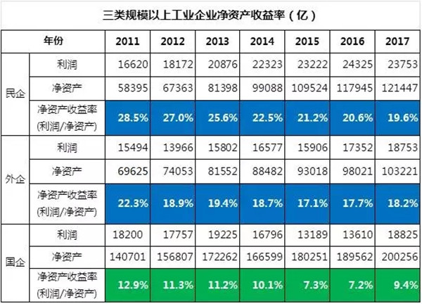 總利潤÷凈資產(chǎn),就能得出一個(gè)很有意義的數(shù)據(jù):凈資產(chǎn)收益率。這個(gè)數(shù)據(jù)乃是反映企業(yè)經(jīng)營效率的核心數(shù)據(jù)。通過比較民企、外企和國企的凈資產(chǎn)收益率情況,我們就能清晰的知道,到底誰掙錢的能力更強(qiáng)。所以下表就是本文放出來的第一個(gè)大招。注意,本文后面還有兩個(gè)大招,各位在看完下表后不要急著抨擊某戰(zhàn)五渣,因?yàn)楹竺孢€會(huì)有更加震撼的數(shù)據(jù)。