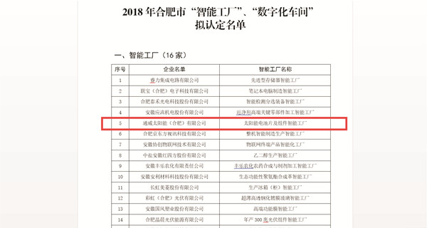 近日,合肥市經濟和信息化委員會網站公示了2018年合肥市“智能工廠”、“數字化車間”擬認定名單,通威太陽能(合肥)有限公司“太陽能電池片及組件智能工廠”榮列公示榜單,展現了公司在信息化和智能制造技術方面的高效應用,同時也是對公司取得的自動化、信息化、智能化成果的充分肯定。