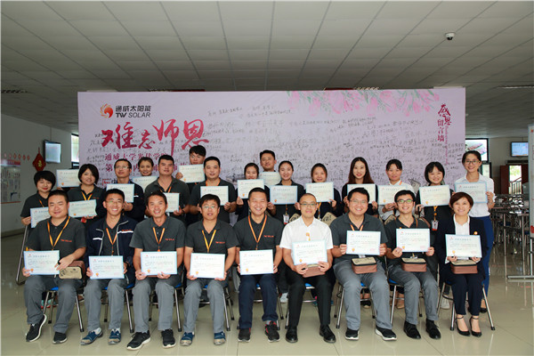 又一個(gè)收獲的季節(jié)碩果飄香,又一個(gè)期待的九月祝福飛揚(yáng)。在這秋韻蕩漾的日子里,通威太陽(yáng)能全體同仁共同迎來(lái)了全國(guó)第34個(gè)教師節(jié)。值此之際,通威大學(xué)光伏學(xué)院特開(kāi)展以“感念師恩”為主題的內(nèi)訓(xùn)師教師節(jié)活動(dòng)。通威太陽(yáng)能合肥基地總經(jīng)理謝泰宏、成都基地總經(jīng)理蕭圣義分別出席兩地活動(dòng),為內(nèi)訓(xùn)師送上祝福。