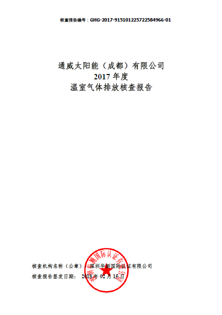 近日,深圳華測國際認(rèn)證有限公司根據(jù)《工業(yè)其他行業(yè)企業(yè)溫室氣體排放核算方法及報告指南(試行)》的要求對通威太陽能(成都)有限公司2017年度的溫室氣體排放報告進行核查,經(jīng)過對生產(chǎn)現(xiàn)場的認(rèn)真評審和各項數(shù)據(jù)源的詳細跟蹤核查,核查組認(rèn)為:通威太陽能(成都)有限公司報告的2017年度核算邊界與排放源識別完整,活動水平數(shù)據(jù)與排放因子選取準(zhǔn)確,溫室氣體排放信息和數(shù)據(jù)是可核查的,排放報告與核算方法符合指南要求,并出具2017年度溫室氣體核查報告。