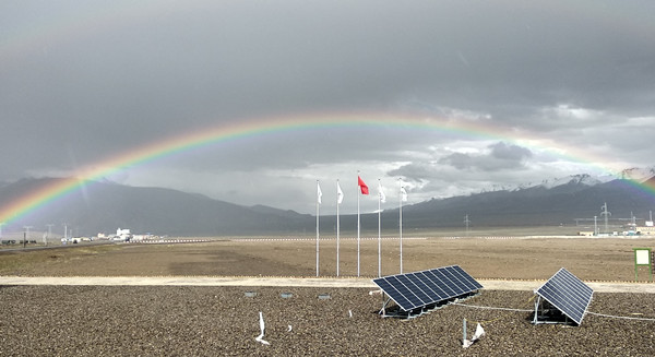 通威集團“青藏綠色驛站”離網(wǎng)光伏發(fā)電系統(tǒng)在彩虹下映照