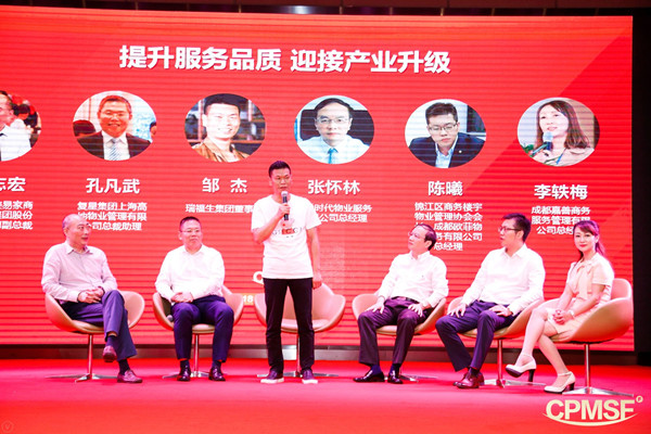 深圳市美易家商務服務集團股份有限公司副總裁張志宏,復星集團上海高地物業管理有限公司總裁助理孔凡武,瑞福生集團董事長鄒杰,誠悅時代物業服務有限公司總經理張懷林,錦江區商務樓宇物業管理協會會長、成都歐菲物業服務有限公司總經理陳曦,成都嘉善商務服務管理有限公司總經理李軼梅圍繞“提升服務品質,迎接產業升級” 進行了熱烈討論與分享。