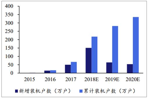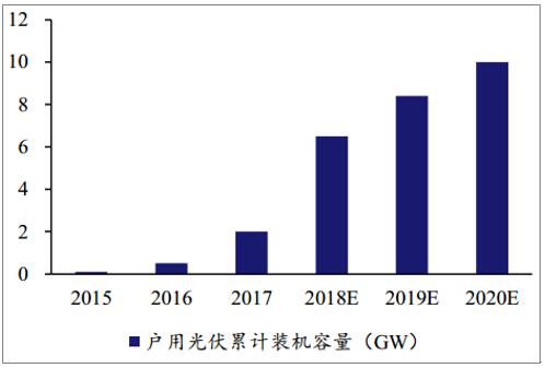 戶用光伏市場廣闊,未來大有可為。預(yù)計(jì)國內(nèi)有超過4000萬戶獨(dú)立屋頂,其中約有50%具備安裝戶用光伏系統(tǒng)的條件,假設(shè)每套裝機(jī)容量為5kW,那么裝機(jī)容量能夠達(dá)到100GW。如果具備安裝條件的屋頂中有 20%-50%安裝戶用光伏系統(tǒng),那么市場規(guī)模將達(dá)到3,200-8,000億元,而目前已經(jīng)開發(fā)的屋頂數(shù)量占比還不到5%,市場前景良好。2018年我國戶用光伏累計(jì)裝機(jī)量預(yù)計(jì)能夠達(dá)到6-8GW,預(yù)計(jì)2020年市場規(guī)??梢猿^10GW。