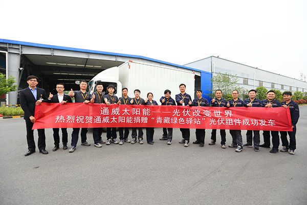 經(jīng)過與“青藏綠色驛站”發(fā)起者——四川省綠色江河環(huán)境保護(hù)促進(jìn)會的積極溝通、確立電站設(shè)計方案,通威立即行動起來。4月13日,本次用于捐贈“青藏綠色驛站”昆侖山、三江源、風(fēng)火山三處站點(diǎn)的光伏組件全部準(zhǔn)備完畢,并在通威太陽能(合肥)有限公司成功發(fā)車。通威綠色能源挺進(jìn)青藏“無人區(qū)”的征程正式開始了!