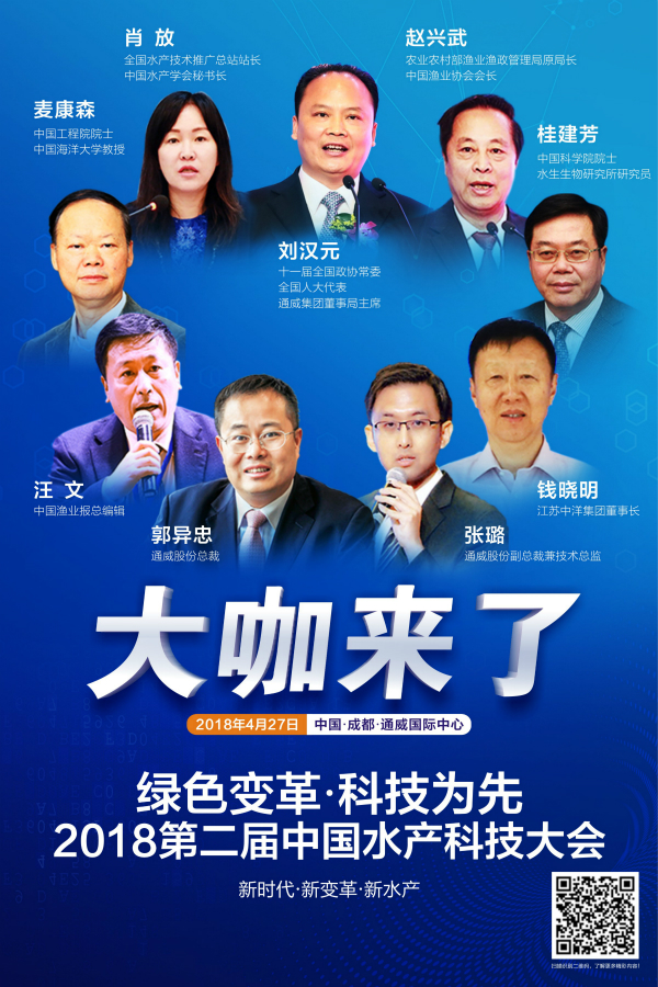 4月27日,以“綠色變革,科技為先”為主題的2018第二屆中國水產科技大會將在通威國際中心隆重啟幕。眾多頂級大咖“空降”蓉城,在這場中國水產行業的頂級盛會上,論道水產、智慧碰撞,助力中國水產行業破冰前行。