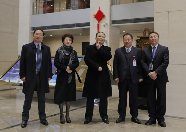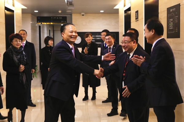 劉漢元主席等總部領(lǐng)導(dǎo)在大廳迎接新年后第一天上班的員工