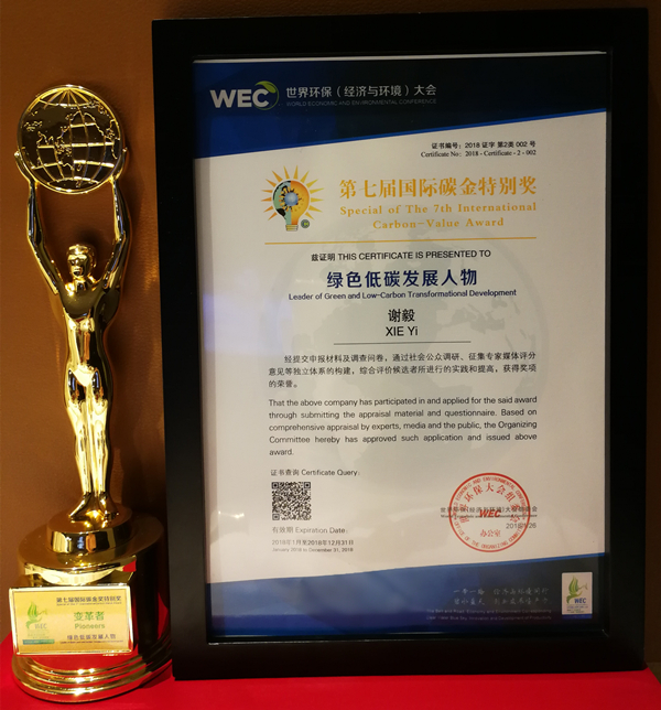 “第七屆國際碳金獎特別獎?綠色低碳發(fā)展人物”獎牌與獎杯