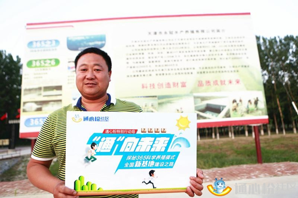 李老板在通威“365科學(xué)養(yǎng)殖模式”宣傳欄前留影