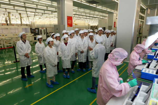 在S1電池車間,同學們詳細了解了成都基地太陽能電池片的生產流程和生產工藝。參觀結束后,通威“誠信正一”的經營理念,生產車間高度自動化的電池片產線、先進的科技設備以及嚴格規(guī)范的現(xiàn)場管理均給同學們留下了深刻印象。