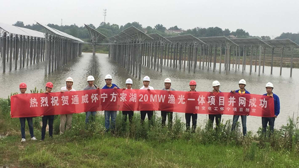 安徽懷寧方家湖20MWp “漁光一體”光伏發(fā)電項(xiàng)目員工齊賀并網(wǎng)成功