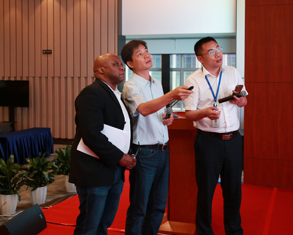 首批到達峰會現(xiàn)場的嘉賓是本次大會邀請的外籍重量級嘉賓,美國人工智能專家、東莞引進創(chuàng)業(yè)領(lǐng)軍人才Tony Huang,資深國際法律師、哈佛大學(xué)專家Jonathan K. Waldrop,硅谷科技創(chuàng)新、投資人顧問Cameron Nazeri,硅谷法規(guī)創(chuàng)新專家Jack Shaw。到達會議現(xiàn)場,幾位嘉賓便馬不停蹄開始彩排。專家Jonathan K. Waldrop更是把一行人晾在一邊,專注地與翻譯人員溝通明天主題演講的內(nèi)容。