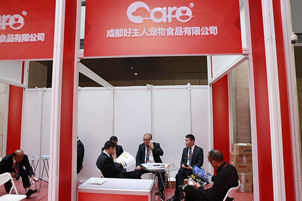 嘉賓們在成都好主人寵物食品有限公司的展臺內翻閱好主人的資料