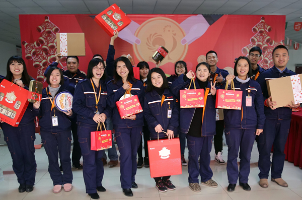 與此同時(shí),成都公司豐富的新春禮品包,喜氣洋洋的祝福展板讓整個(gè)廠區(qū)溫情滿滿,喜悅多多。蘋果與橙子拼成的水果大禮包,寓意著 “橙意滿滿,蘋蘋安安”,光是這份用心就足夠感動(dòng)大家。此外,甜甜的巧克力、精心包裝的堅(jiān)果大禮盒更是讓驚喜一波接著一波。