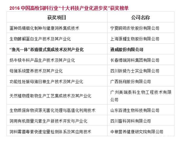 頒獎儀式上,通威“漁光一體”養殖模式集成技術及其產業化榮獲“十大科技產業化進步獎”,通威股份嚴虎副董事長榮獲“十大年度經濟人物”稱號。通威股份成為本次盛典唯一榮獲兩項殊榮的公司,更加彰顯了通威技術領航與創新發展的實力。獲獎企業對于推進我國養殖行業向規模化、集約化、生態化發展,以及提供安全、綠色食品的堅定信念及所作出的努力得到現場嘉賓們的高度認可。