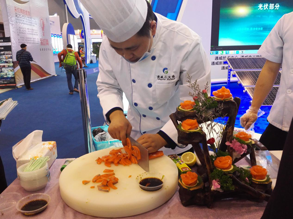 據了解,目前西博會正處于第一階段(3日-6日),以新興科技類產品及企業展示為主,其中匯集電子信息產業新技術及設備產品的5號電子信息館尤為引人注目,“互聯網+”、智能終端、機器人、云計算等新興產業展館佇立其中,受邀參加本屆西博會的通威集團主展館也位于5號館內。為展示通威在農業和新能源雙主業方面得天獨厚的優勢,“漁光一體”智能模擬塘設置在展館最顯眼處,魚池中央架設小型太陽能電池板,中華鱘、金鱒、裸裂尻等珍稀魚種在池中游弋,水產養殖和光伏發電跨界結合的模式,在提供安全水產品的同時,也促使生產節能環保的清潔能源成為可能。為使觀眾更直觀了解通威打造世界級健康安全食品供應商的目標,展館每日推出通威三文魚現場品鑒活動,都江堰基地新鮮直送三文魚,再由廚師現場制作刺身和壽司等代表菜色,爽滑細膩的口感令參展觀眾大呼過癮。