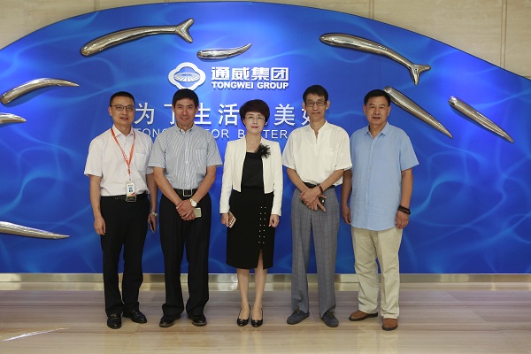 9月9日,山東省濱州市發改委副主任劉連營、匯泰集團有限公司董事長張榮強到訪通威,通威集團禚玉嬌總裁熱情接待并座談,深圳通威新能源有限公司總經理、濱州通匯海洋科技有限公司總經理鄧衛平,濱州通匯海洋科技有限公司常務副總經理萬國權陪同接待。