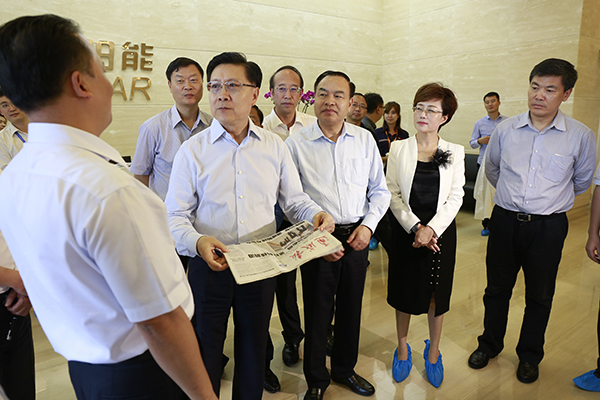 在聽取相關(guān)匯報后,王書記還閱覽了最新一期《通威報》上關(guān)于江蘇省委李強書記一行視察通威如東“漁光一體”基地的新聞報道。王書記對通威集團34年穩(wěn)健發(fā)展所取得的成就表示高度贊賞,并對通威太陽能(成都)有限公司雙流5GW高效晶硅電池項目的建設(shè)速度及先進的生產(chǎn)技術(shù)給予了充分肯定。