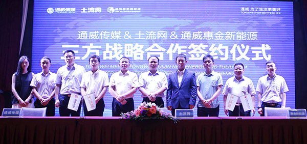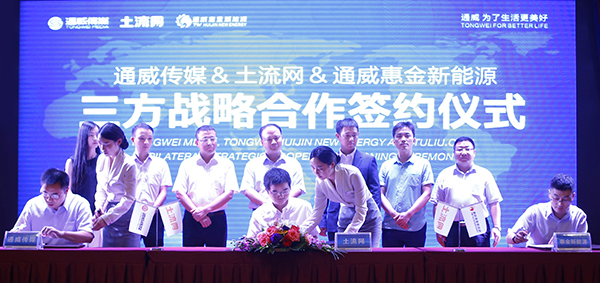 隨后,在劉漢元主席、副總裁黃其剛、通威惠金新能源有限公司總經(jīng)理馮德志、土流網(wǎng)創(chuàng)始人兼CEO伍勇等領導的共同見證下,通威傳媒總經(jīng)理甘曉飛、通威惠金新能源有限公司副總經(jīng)理賴永斌、土流網(wǎng)聯(lián)合創(chuàng)始人兼副總裁陶慧龍代表三方現(xiàn)場簽署了合作協(xié)議。