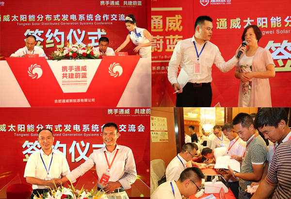 通過交流會上的經(jīng)驗分享及互動,參會來賓對分布式發(fā)電系統(tǒng)的發(fā)展前景及合作方式有了更加充分的了解。來自傳統(tǒng)養(yǎng)殖、礦業(yè)、物流、國際貿(mào)易等各行各業(yè)的合作伙伴躊躇滿志,表現(xiàn)出強烈的合作意愿。在隨后舉行的簽約儀式上,現(xiàn)場成功達成了2048千瓦的約定安裝量。以此次會議為契機,通威新老合作伙伴在全國農(nóng)村、城鎮(zhèn)推廣太陽能分布式中小型家庭發(fā)電站上邁出了堅實一步。