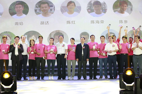 2015年9月20日通心粉之夜晚會上,四川省陳文華副省長、集團劉漢元主席和20名“最美通心粉”合影
