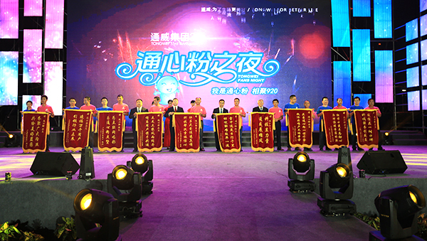 在通威集團33周年慶暨通心粉之夜晚會現場,10名“通心粉”向通心粉社區贈送錦旗
