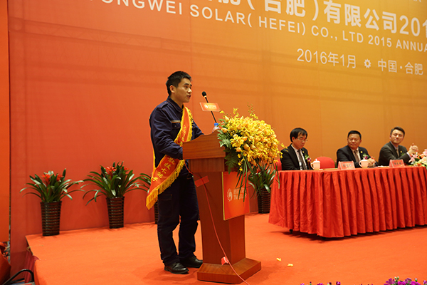財務(wù)部經(jīng)理安祥作為優(yōu)秀管理干部代表發(fā)言,他表示,2015年是公司“跳起摸高”的一年,在謝毅董事長及高管團(tuán)隊的帶領(lǐng)下,全體員工奮勇拼搏,公司取得了斐然的經(jīng)營業(yè)績。在公司的各個管理層級,還有很多比他更優(yōu)秀的同仁一直在默默耕耘、辛勤付出。集團(tuán)敢于在市場沒有明顯回暖跡象時,以8.7億元的重金收購公司,不單是前期長時間科學(xué)客觀研判的結(jié)果,也是基于深耕新能源產(chǎn)業(yè)多年來,對行業(yè)發(fā)展的精準(zhǔn)洞察。2014年上半年,公司在市場反映不如預(yù)期的情況下,并沒有簡單放棄、消極怠工,而是積極通過科學(xué)的測算和評估,對外積累客戶資源、發(fā)掘市場機(jī)會、尋找突破口,對內(nèi)苦練內(nèi)功、對標(biāo)改善、夯實基礎(chǔ)。2014年下半年,公司敏銳捕捉到市場回暖的信號,利用前期的資源和管理基礎(chǔ)迅速通過市場倒逼的方式及時調(diào)整經(jīng)營策略,高度匹配市場需求,從而帶動產(chǎn)能的持續(xù)高效發(fā)揮,實現(xiàn)了公司2015年出貨量國內(nèi)第一、質(zhì)量評價行業(yè)第一、成本行業(yè)內(nèi)最低,造就了行業(yè)領(lǐng)導(dǎo)者地位。安祥認(rèn)為,通威太陽能(合肥)公司的“成功密碼”就是“科學(xué)決策、穩(wěn)扎穩(wěn)打、市場驅(qū)動、持之以恒”!