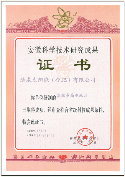 通威太陽能(合肥)有限公司產(chǎn)品獲“安徽科學(xué)技術(shù)研究成果”證書