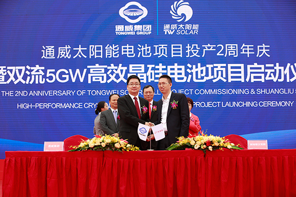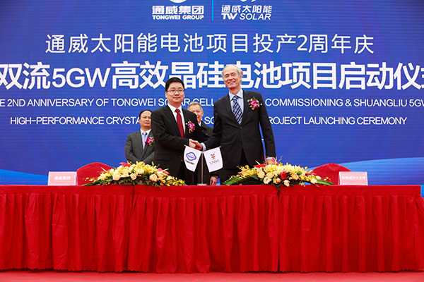 11月18日,在通威太陽能電池項目投產2周年慶暨雙流5GW高效晶硅電池項目啟動儀式上,通威集團與協鑫(集團)控股有限公司、西安隆基硅材料股份有限公司三方共同簽署合資協議,與阿特斯、天合光能、晶科分別簽署長單客戶協議,將各自憑借其優勢環節展開合作、優勢互補,形成更大的產業空間。