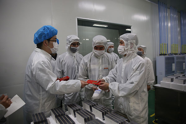火紅的爆竹跳躍著鋪滿合肥公司大門,五彩繽紛的禮花朵朵綻放,整齊的方隊中千余張期待的面孔洋溢著青春的微笑,在掌聲、鞭炮聲的交響樂中,合肥公司正式開啟羊年的新征程!公司董事長謝毅先生率領高管團隊,一一向新年第一天奔赴工作崗位的廣大員工拜年,并遞上暖暖的開門紅包。隨后,謝毅董事長與高管團隊一起,從一車間到四車間,從廠務部門到組件車間,拜望向堅持在生產一線的員工,詳細詢問生產恢復進度向一線主管了解最新生產技術指標情況,鼓勵大家要以時不我待、只爭朝夕的精神,迅速切入工作狀態,保證產品品質、生產進度,為羊年第一單打好堅實的基礎。