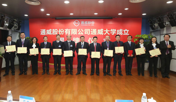 1月26日上午,“通威大學成立揭牌儀式”在集團總部多功能廳隆重舉行。十一屆全國政協(xié)常委、集團董事局劉漢元主席,集團禚玉嬌總裁、股份嚴虎總裁以及集團、股份總部相關領導、部門負責人及各分子公司總經(jīng)理等近200人共同見證通威大學成立這一莊嚴神圣的時刻。北京大學、中國人民大學、四川省內高校的領導、知名教授以及國內知名企業(yè)大學校長、培訓機構負責人來到大會現(xiàn)場觀禮揭牌儀式,并予以熱烈祝賀!