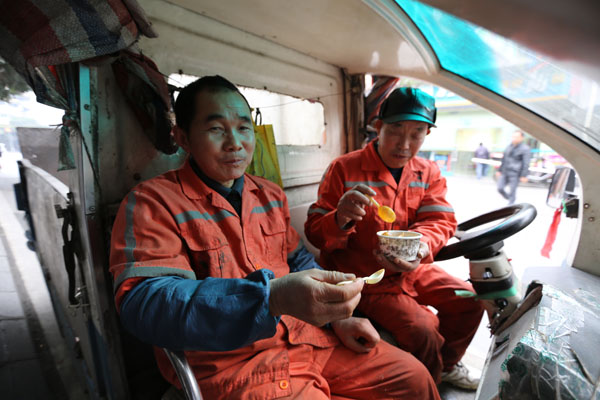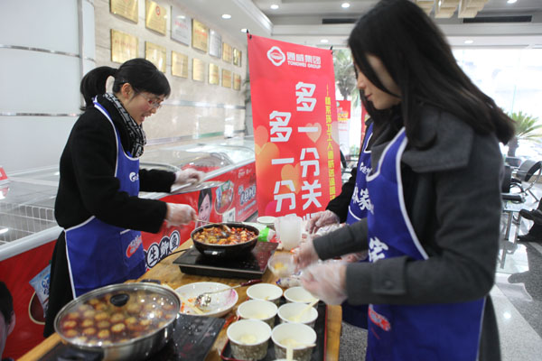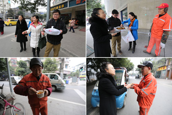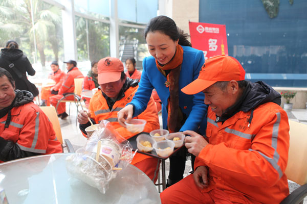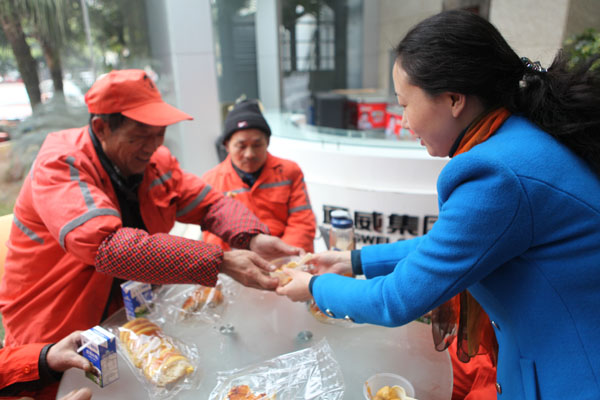 1月13日總部組織員工對(duì)環(huán)衛(wèi)工人捐贈(zèng)棉衣、棉被。1月15日,高新區(qū)工會(huì)何處長(zhǎng)帶領(lǐng)肖家河街道40多位環(huán)衛(wèi)工人到總部,下午2點(diǎn)剛剛從工作崗位上下班還沒(méi)有用午餐的環(huán)衛(wèi)工人一坐下,集團(tuán)工會(huì)李主席和工會(huì)其他成員為環(huán)衛(wèi)工人送上了面包和溫?zé)岬呐D蹋ㄍ称返耐聜兠χ鵀樗麄冎笾~(yú)丸和魚(yú)餃,同事們把一碗碗熱氣騰騰魚(yú)丸送到每個(gè)環(huán)衛(wèi)工人的手上,環(huán)衛(wèi)工人們接過(guò)香噴噴的魚(yú)丸連聲道謝。第一次享受到別人為他們送上的美食,從他們臉上我們看到了幸福和喜悅。送走40多位環(huán)衛(wèi)工人,集團(tuán)工會(huì)李主席在環(huán)衛(wèi)公司工會(huì)曾主席的帶領(lǐng)下將煮熟的魚(yú)丸送到了他們正在勞動(dòng)的崗位上,一位環(huán)衛(wèi)工人端著這熱氣騰騰的魚(yú)丸,激動(dòng)的說(shuō)“通威真是個(gè)不錯(cuò)的公司,我們吃著這碗魚(yú)丸心理真的很溫暖”。同時(shí),通威集團(tuán)工會(huì)和高新區(qū)工會(huì)共同為肖家河街道200多名環(huán)衛(wèi)工人每人贈(zèng)送兩袋通威海南純生魚(yú)丸作為對(duì)環(huán)衛(wèi)工人新春的慰問(wèn),希望他們能在社會(huì)各界的關(guān)懷下度過(guò)一個(gè)溫暖、祥和的春節(jié)。
