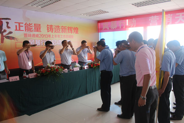 啟動儀式氛圍團(tuán)隊宣誓、團(tuán)隊風(fēng)采展示、簽軍令狀、喝壯行酒幾個環(huán)節(jié)。蓉崍通威人個個激情澎湃、斗志昂揚(yáng),立志完成8-10月團(tuán)隊銷量任務(wù),即豬料實現(xiàn)月平均增量750噸以上,8-10月圓滿完成銷量總額。