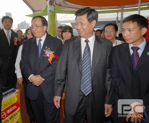 廣東省副省長李容根(左二)在中共茂名市委書記、市人大常委會主任羅蔭國(右二)、市委副書記、市長鄧海光(左一)陪同下參觀茂名通威展位