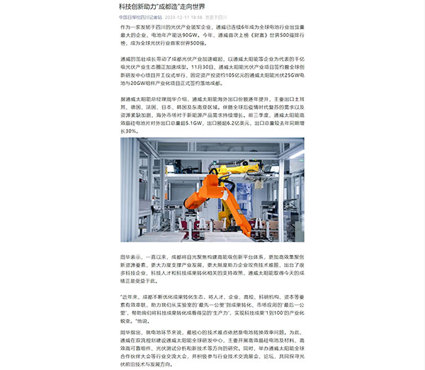 近日,《中國日報》發(fā)表題為《科技創(chuàng)新助力“成都造”走向世界》的報道,并在國際版進行全球推送,聚焦通威太陽能科技創(chuàng)新與發(fā)展。