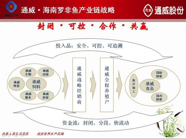 同時,通威將聯合一部分在某方面有特長(比如,在苗種選育上有基礎,有的能夠把苗種選育或者幾個家系做好,有的能夠把中間的細分產品做好)的機構、人員、企業,形成這種戰略聯盟。在這個行業里面,再大的企業都很難自己解決一籃子的問題,而且也不是最優和最低成本的方式。大企業有所為有所不為,小企業專精而為,協同做好,我想這就是大小企業聯手的生存方式。
